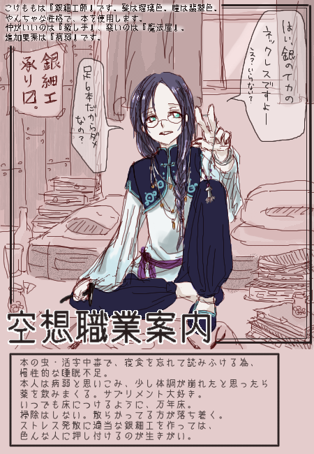 「こけももは『銀細工師』です。髪は瑠璃色。瞳は翡翠色。やんちゃな性格で、本を使用します。仲がいいのは『癒し手』、悪いのは『魔法屋』。追加要素は『病弱』です。」